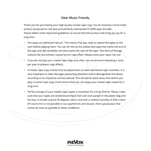 Product information: 1/4″ – 2-Track – CCIR – 15IPS – 320 nWb/m – LPR90 – 10.5″ Revox Metal Reel. Revox deluxe packaging with climate archive box and slipcase. A comprehensive information folder is included. Created personally for each customer and therefore non-returnable.